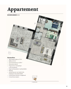 Appartement BOUWNUMMER A50 Kenmerken - Woonoppervlakte ca 73 m2 - Balkon ca 11 m2 - Groot buitenterras ca 38 m2 - Panorama uitzicht - Hoge nok en raampartijen in de woonkamer - Eigen parkeerplaats in parkeerkelder - Berging - Aansluiting voor een elektrische laadpaal in de parkeerkelder - Inclusief basis sanitair en tegelwerk - Inclusief basis keuken BG 1 2 345 A50 5e VERDIEPING 35 N