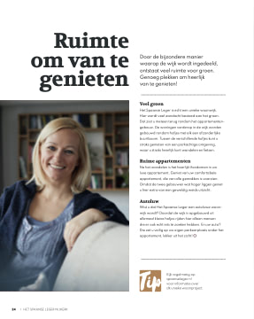 Ruimte om van te genieten Door de bijzondere manier waarop de wijk wordt ingedeeld, ontstaat veel ruimte voor groen. Genoeg plekken om heerlijk van te genieten! Veel groen Het Spaanse Leger is echt een unieke woonwijk. Hier wordt veel aandacht besteed aan het groen. Dat ziet u meteen terug rondom het appartementen- gebouw. De woningen verderop in de wijk worden gebouwd rondom hofjes met elk een afzonderlijke buurtboom. Tussen de verschillende hofjes kunt u straks genieten van een parkachtige omgeving, waar u straks heerlijk kunt wandelen en fietsen. Ruime appartementen Na het wandelen is het heerlijk thuiskomen in uw luxe appartement. Geniet van uw comfortabele appartement, die van alle gemakken is voorzien. Omdat de twee gebouwen wat hoger liggen geniet u hier extra van een geweldig weids uitzicht. Autoluw Wist u dat Het Spaanse Leger een autoluwe woon- wijk wordt? Doordat de wijk is opgebouwd uit allemaal kleine hofjes rijden hier alleen mensen die er ook echt iets te zoeken hebben. En uw auto? Die zet u veilig op uw eigen parkeerplaats onder het appartement, lekker uit het zicht! Kijk regelmatig op spaanseleger.nl voor informatie over dit unieke woonproject. Tip 24 | HET SPAANSE LEGER NIJKERK